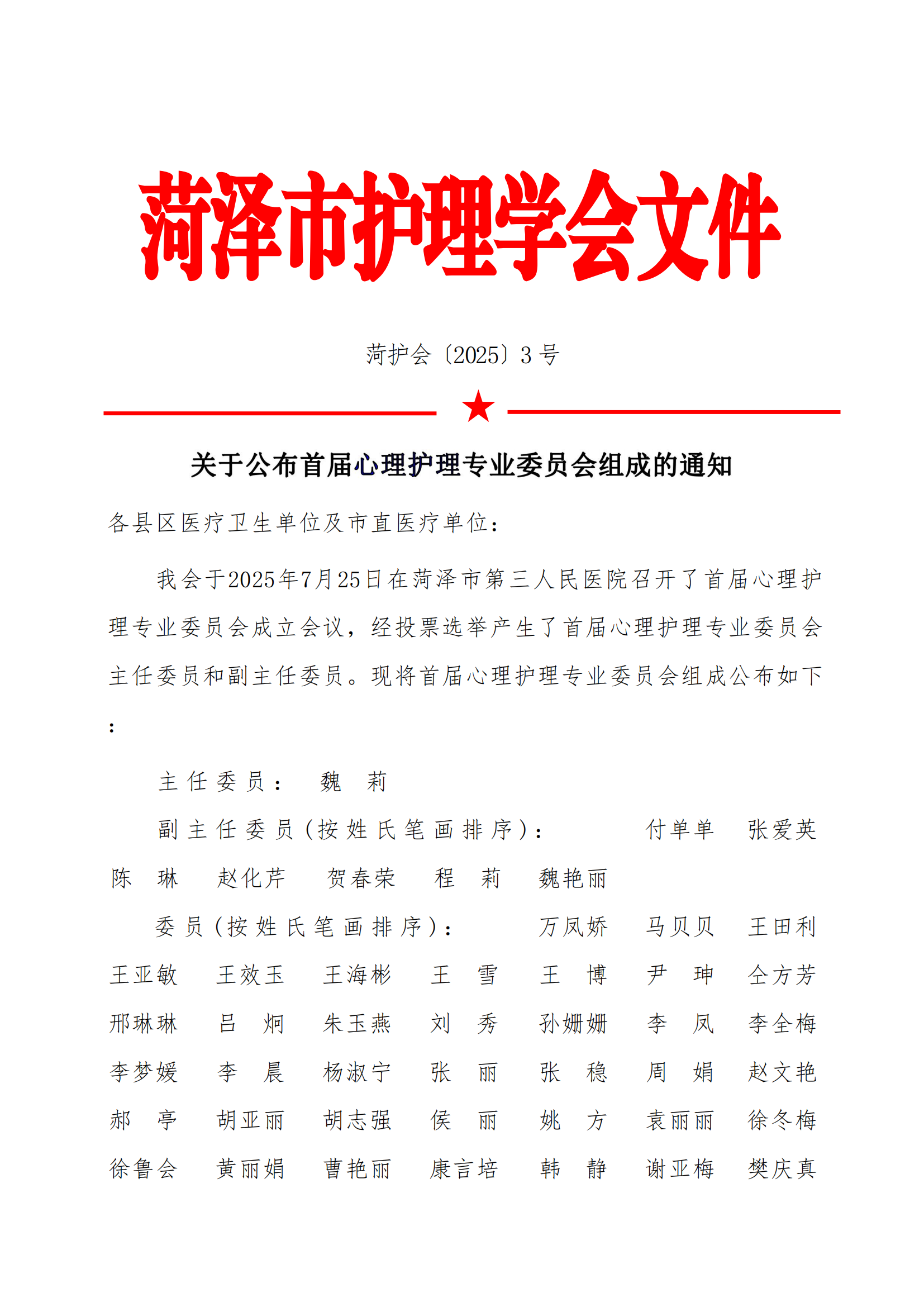 关于公布首届心理护理专业委员会组成的通知